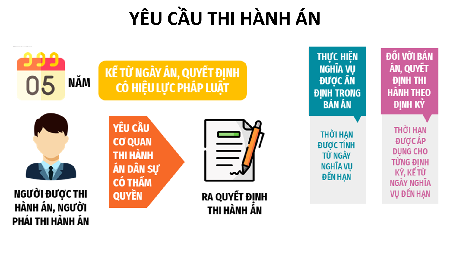 1. Trong thời hạn 05 năm, kể từ ngày bản án, quyết định có hiệu lực pháp luật, người được thi hành án, người phải thi hành án có quyền yêu cầu cơ quan thi hành án dân sự có thẩm quyền ra quyết định thi hành án.
