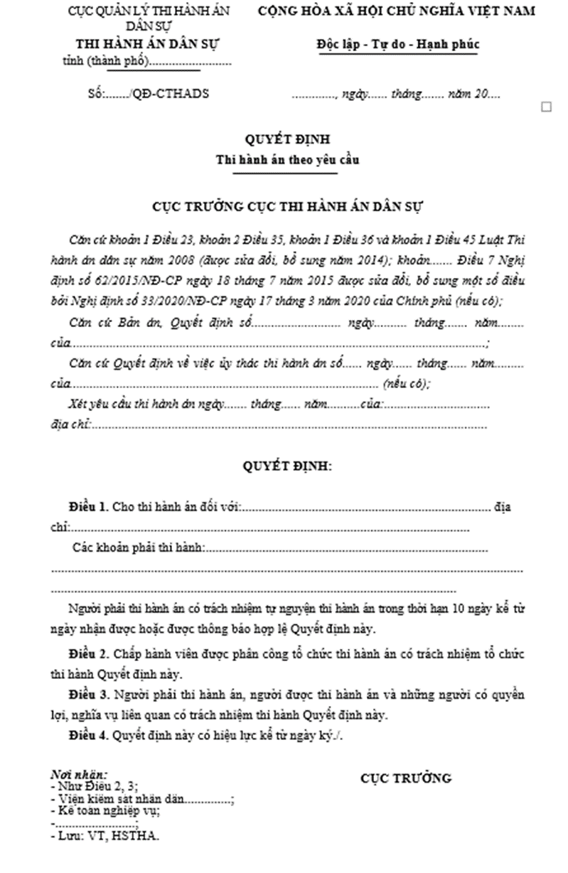 1. Ra Quyết định thi hành án theo yêu cầu